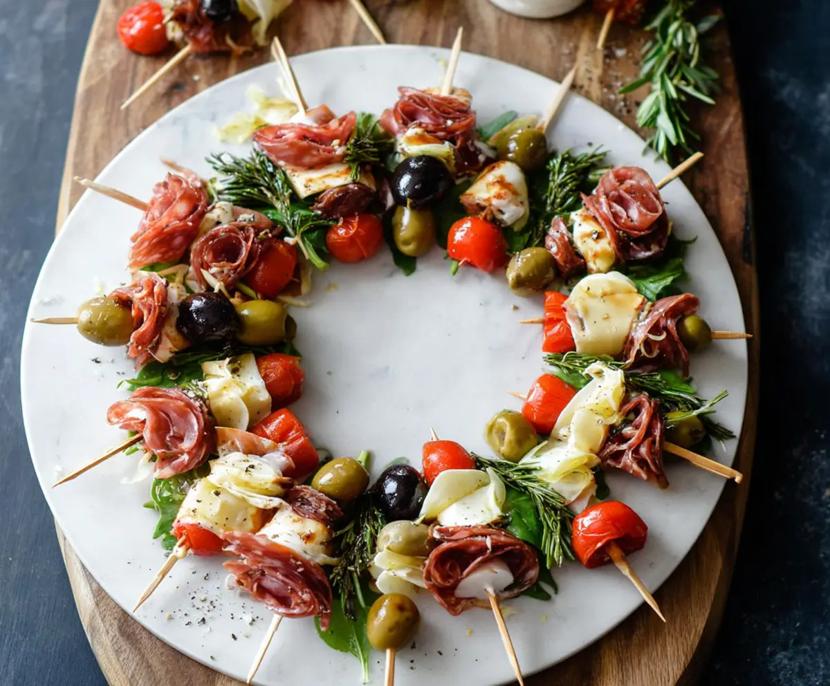 Arranging the skewers nicely is key to making an eye-catching antipasto wreath. Here’s a simple way to approach it: