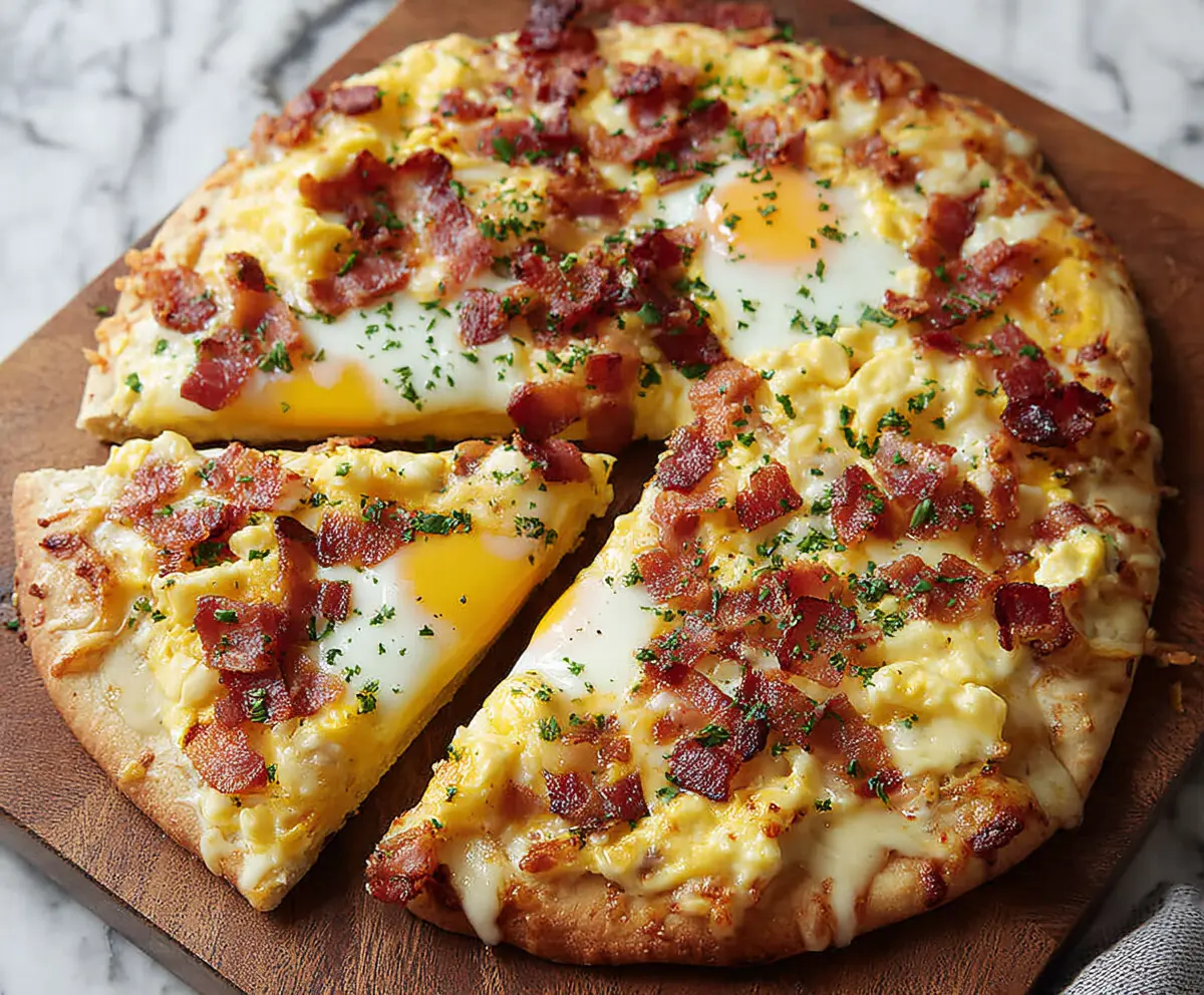 Your Bacon Egg Breakfast Pizza is ready to be enjoyed! Featuring crispy bacon, fluffy eggs, and melted cheese on a warm crust, this dish is a breakfast dream come true!
