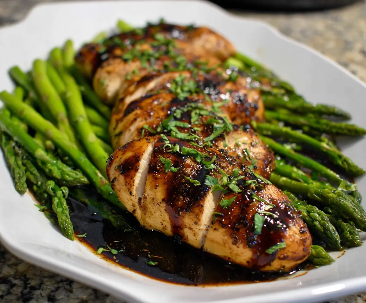 To serve, plate the balsamic chicken alongside the asparagus. Drizzle any remaining balsamic sauce over both. Garnish with fresh parsley or basil, and if you like, add lemon wedges on the side for an extra zing!