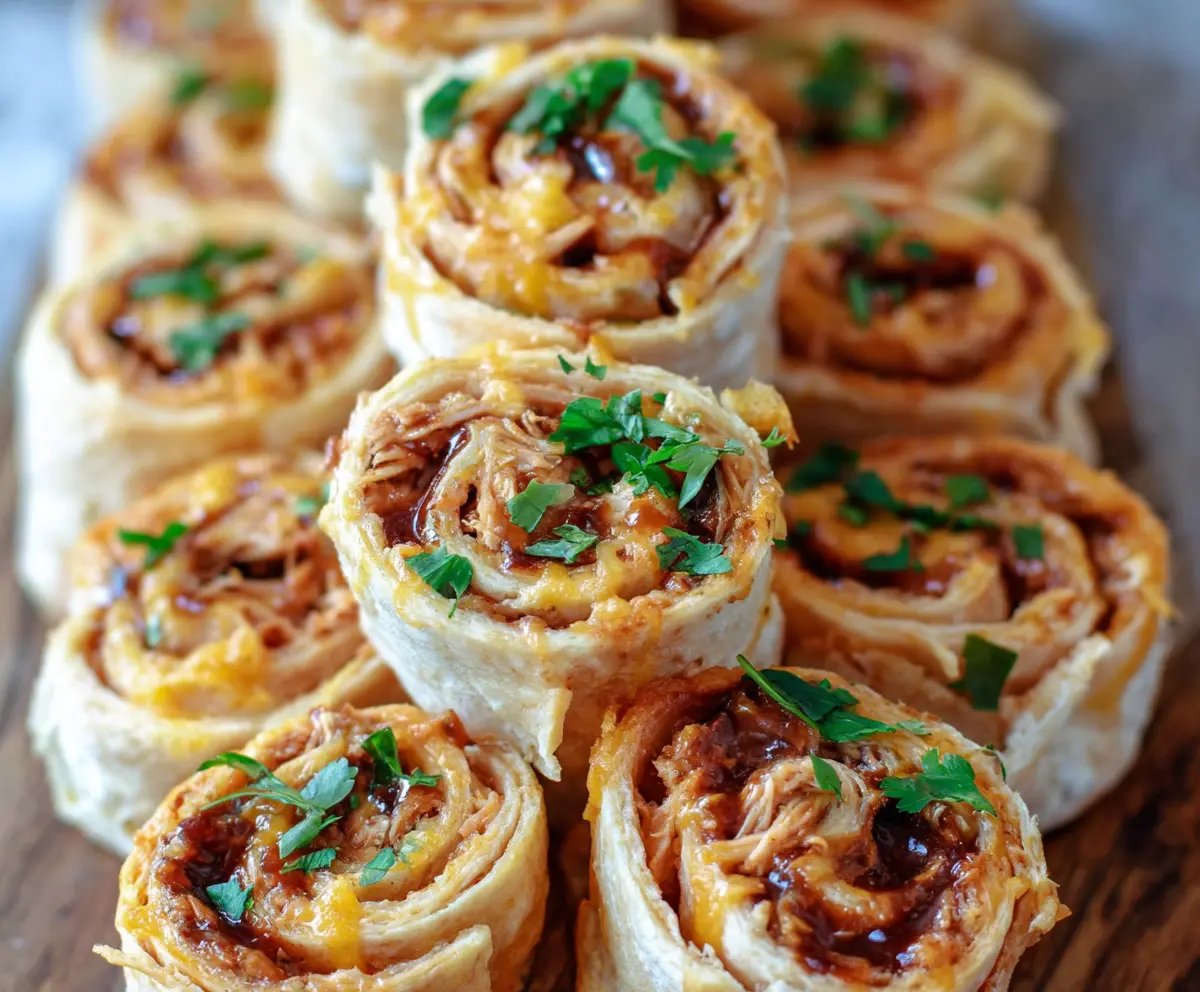Arrange all the pinwheels on a serving platter. Drizzle some extra BBQ sauce over them and sprinkle chopped cilantro on top for a burst of color and freshness.