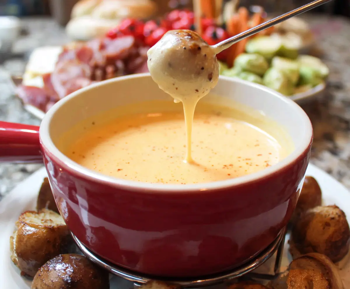 Use fondue forks or skewers to dip the assorted veggies and bread into the warm cheese. Enjoy every gooey and cheesy bite!