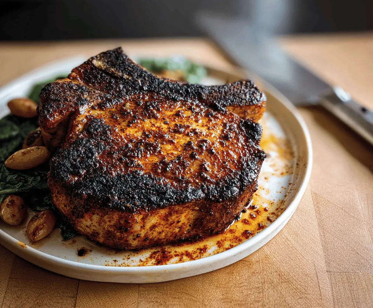 Serve the blackened pork chops hot, with a garnish of fresh thyme if you like. They pair deliciously with sautéed baby spinach and roasted garlic cloves for a complete meal. Enjoy!