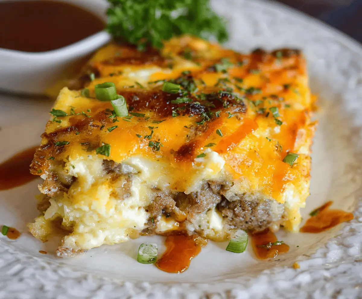 Your hearty breakfast sausage casserole is ready to be served hot! It pairs perfectly with fresh fruit or breakfast potatoes for a complete meal.