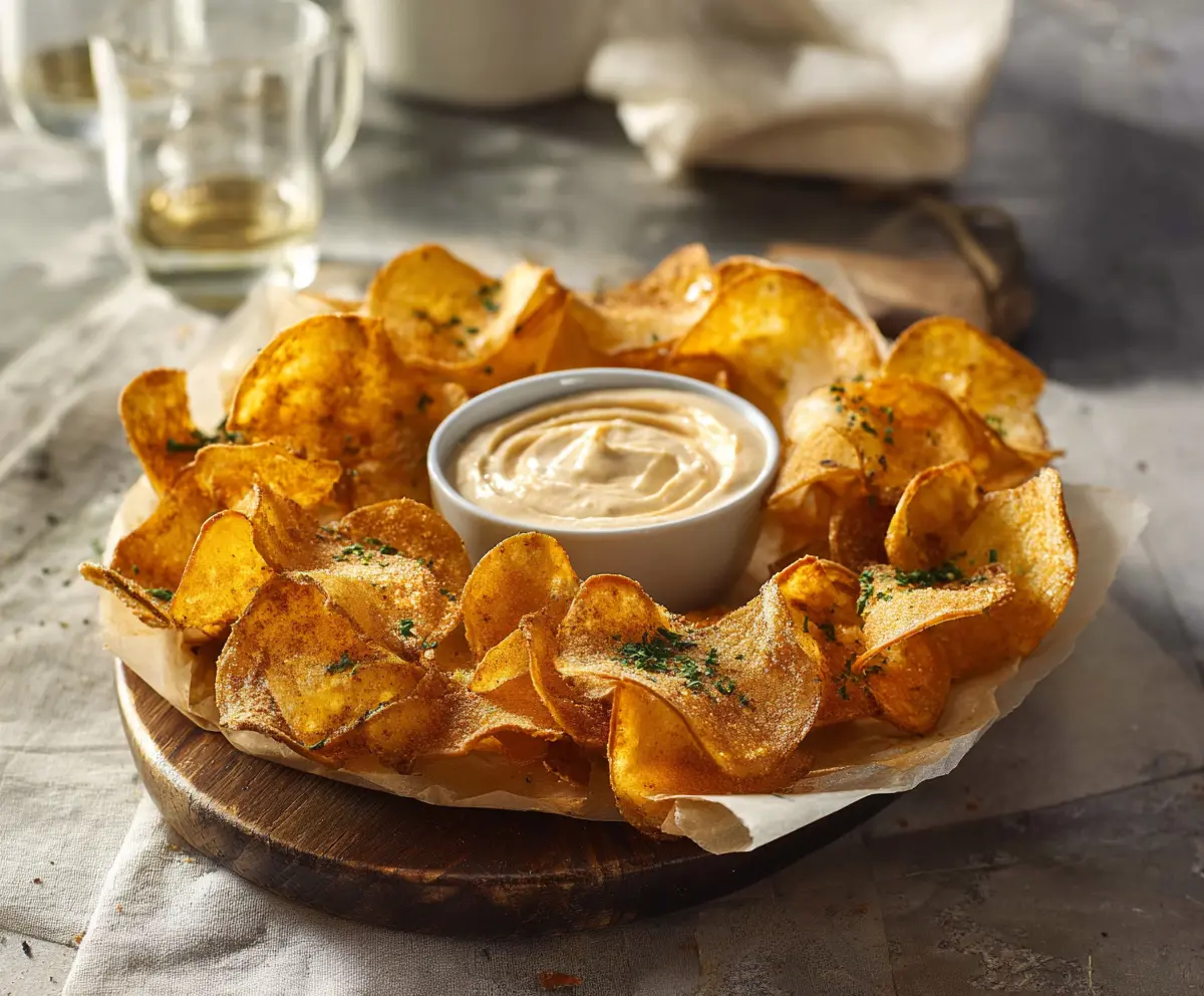 Next, heat vegetable oil in a deep fryer or a large, heavy-bottomed pot until it reaches 350°F (175°C). In a large bowl, toss the dried potato slices with paprika, garlic powder, onion powder, cayenne pepper, salt, and black pepper, ensuring they’re evenly coated. Carefully fry the potato slices in batches—be sure not to overcrowd the pot—for about 2-3 minutes per batch or until they’re golden brown and crispy. Use a slotted spoon to remove them and drain on paper towels. Tap with a bit more salt if desired, and keep them warm while you prepare the dip.