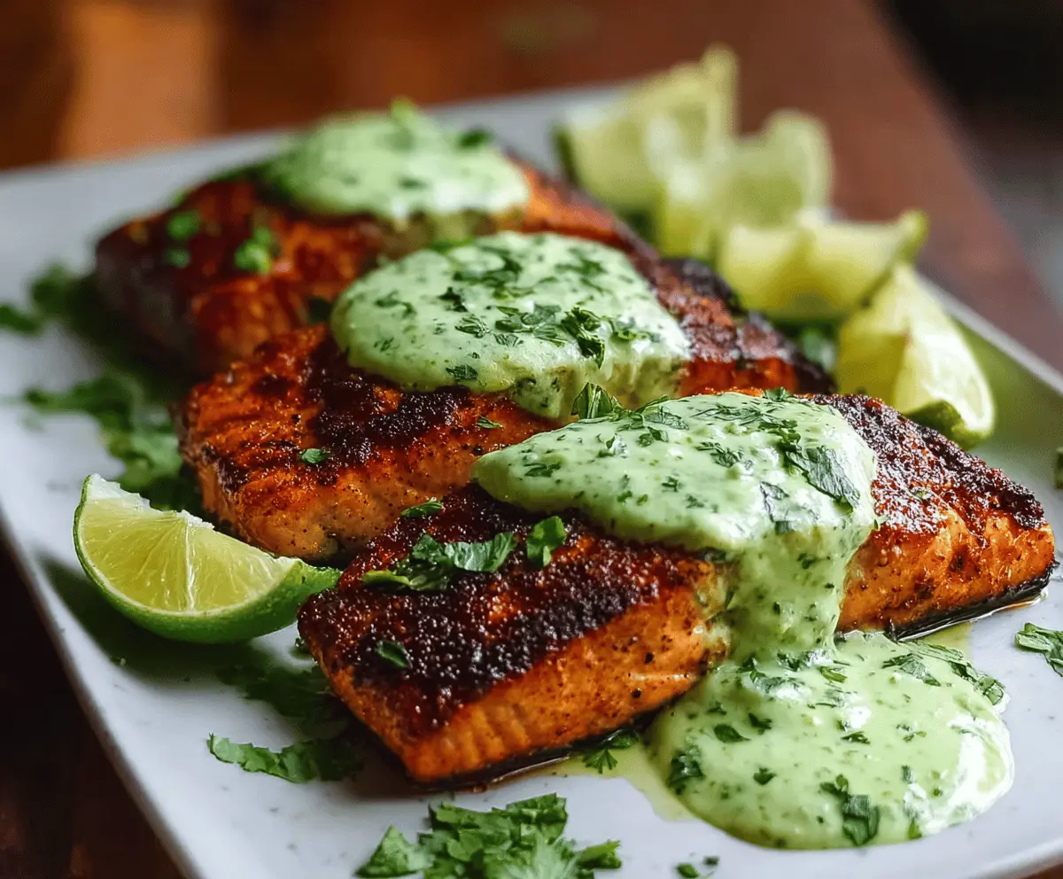 Enjoy this tasty and spicy salmon dish with the cooling avocado lime sauce—it’s perfect for a refreshing, vibrant meal!