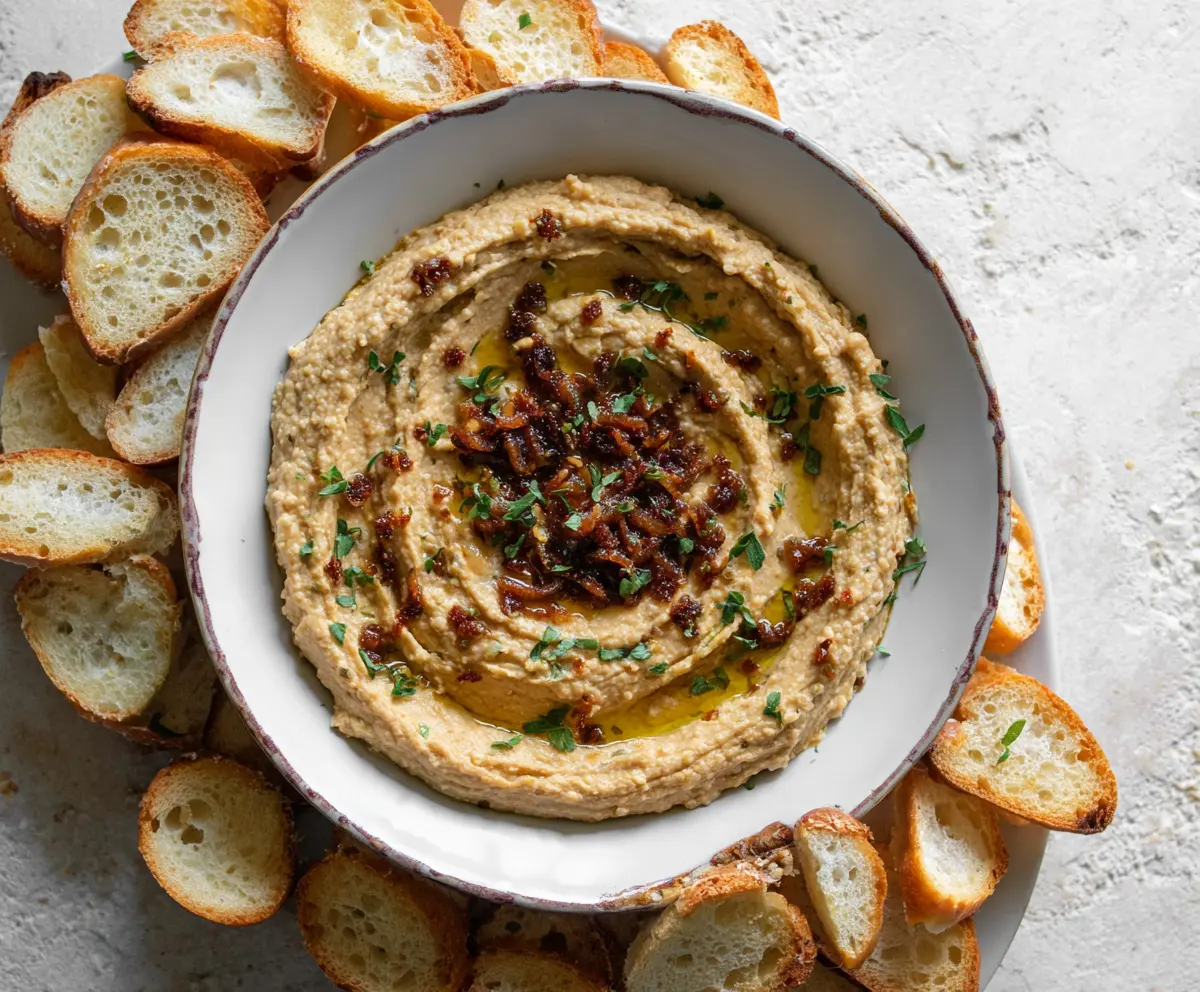 This Caramelized Onion White Bean Dip is creamy and tasty! With sweet caramelized onions and smooth white beans, it’s perfect for sharing at parties or enjoying on your own.