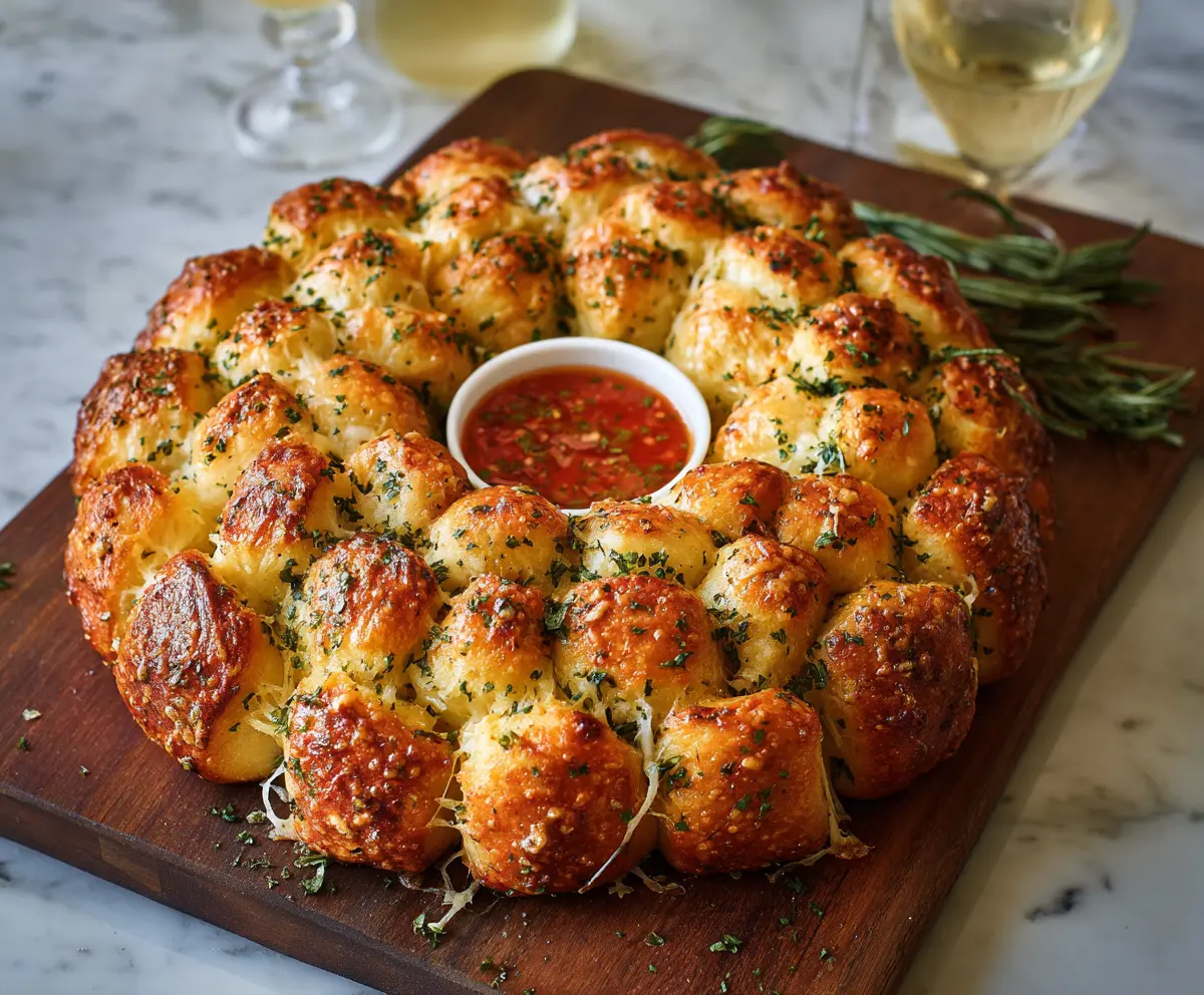 This Cheesy Garlic Pull-Apart Wreath is a fun and tasty treat! Soft bread pieces are coated in garlic butter and loaded with gooey cheese, making it perfect for sharing.