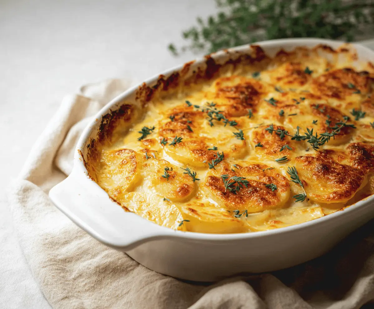 Enjoy your creamy, cheesy scalloped potatoes—rich, comforting, and perfect for any meal! Serve with your favorite protein or on their own, and don’t forget the thyme garnish for a touch of color!