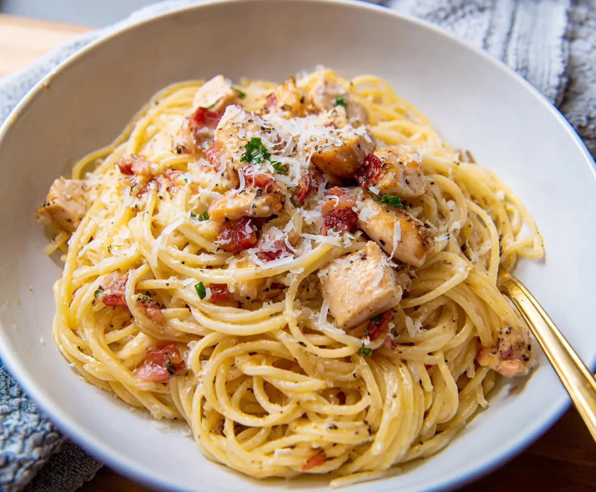 This recipe provides a wonderful balance of classic carbonara flavors with tender chicken, making it a satisfying meal for any occasion.