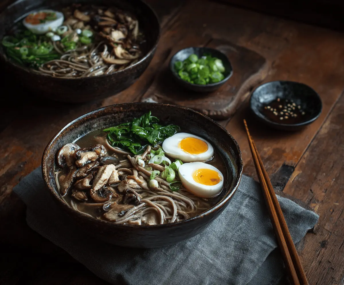 Now it’s time for the fun part! Divide the cooked soba noodles among your serving bowls. Ladle the hot broth with the mushrooms and greens over the noodles. Top each bowl with the sliced chicken, halved soft-boiled eggs, and sprinkle with sliced green onions. Don’t forget to add a sprinkle of toasted sesame seeds for that lovely crunch!