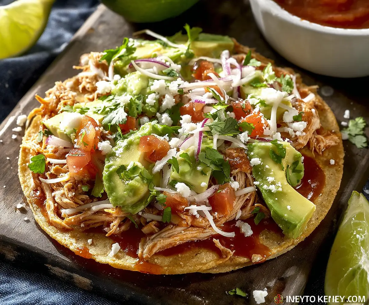 Chicken tostadas are crispy tortillas topped with tasty seasoned chicken, fresh veggies, and creamy avocado. It’s a fun, hand-held meal that everyone loves!