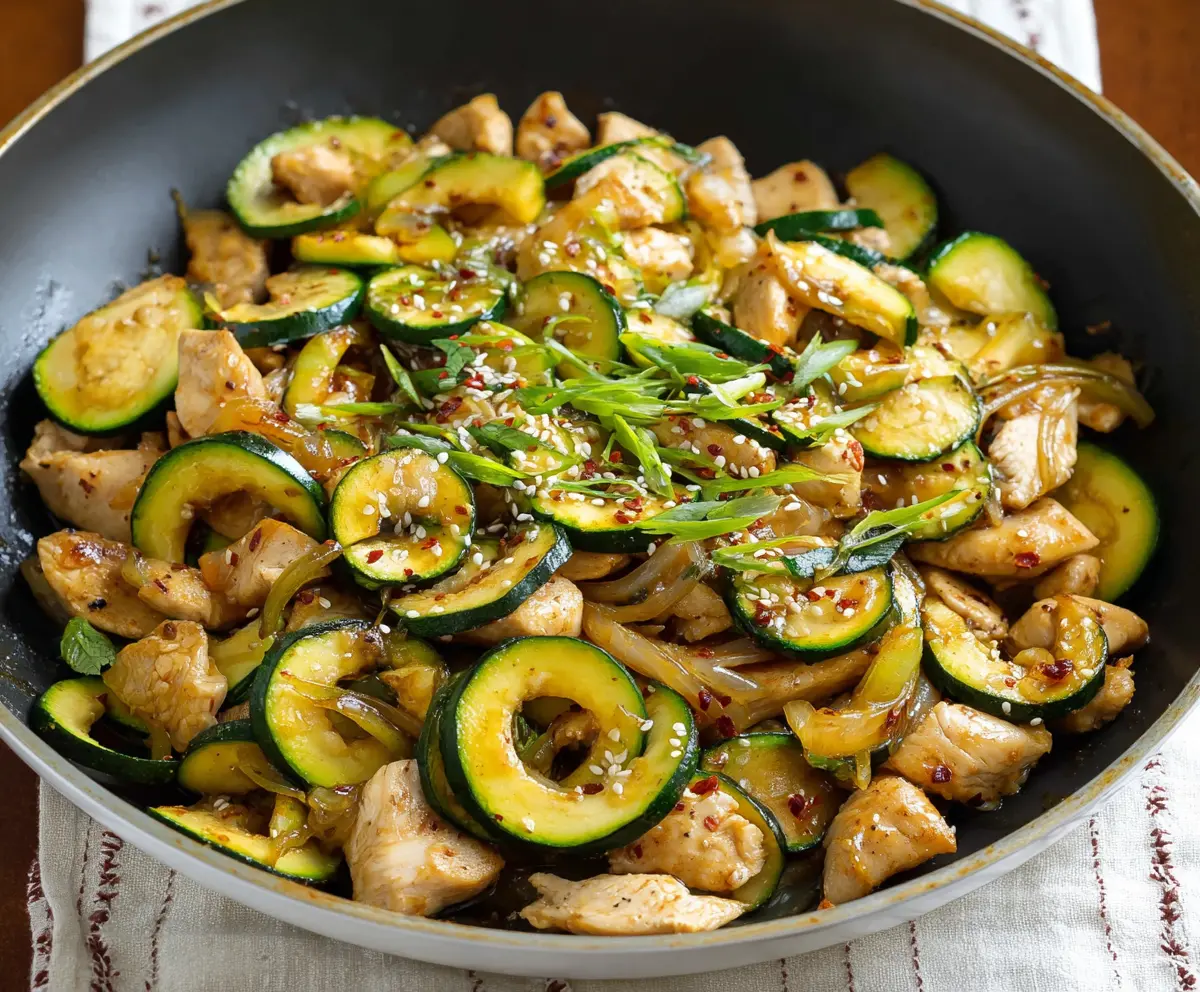 In a small bowl, whisk together the soy sauce, oyster sauce (if you’re using it), sesame oil, honey or brown sugar, and crushed red pepper flakes. Pour this sauce over the chicken and zucchini in the pan. Toss everything together until well-coated, and let it cook for another 2 minutes to allow all the flavors to meld.