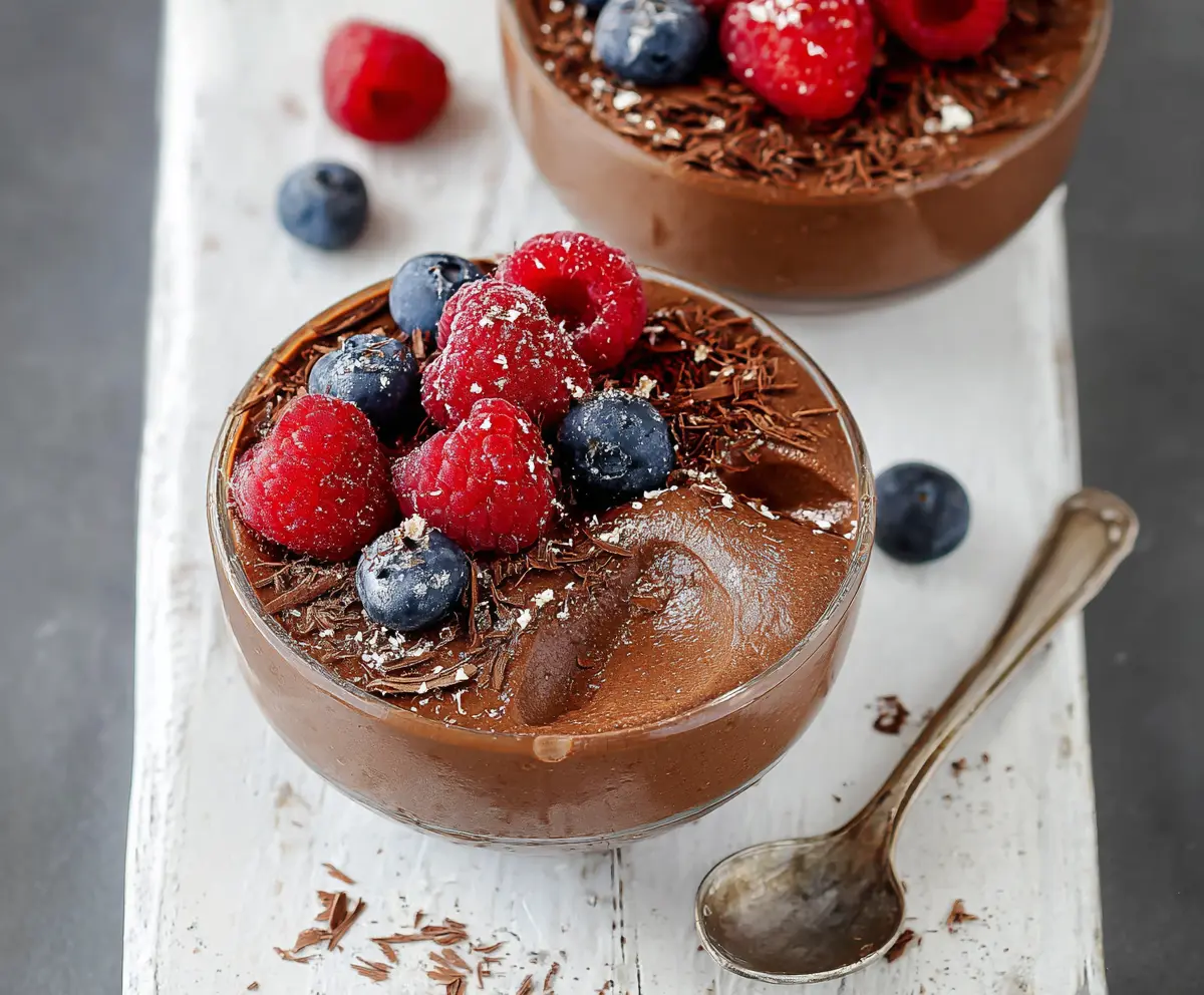 Before serving, load up the tops of your mousse with fresh raspberries and blueberries, and sprinkle on dark chocolate shavings. For a little extra flair, add a sprinkle of sea salt flakes. It adds a nice contrast to the sweetness!