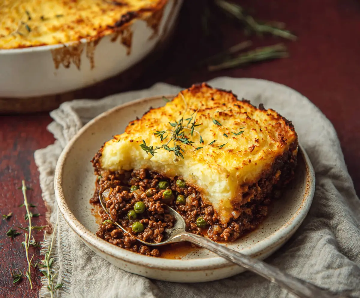 Once out of the oven, let it sit for a minute. Garnish with fresh thyme sprigs if you like, and serve hot. Enjoy your delicious Cottage Pie!