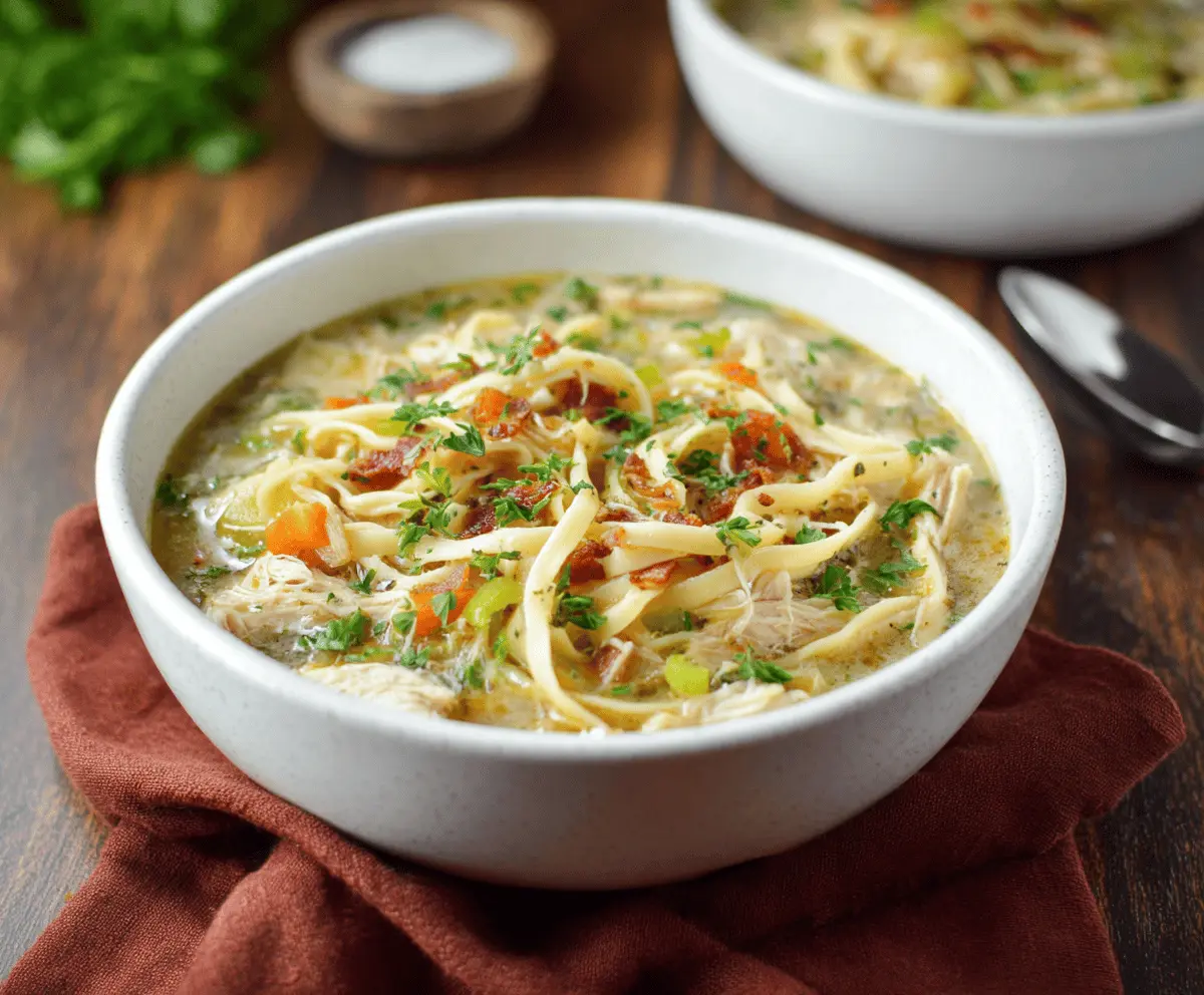 Your dairy-free chicken noodle soup is ready to serve! Ladle the soup into bowls and garnish with fresh chopped parsley. If desired, sprinkle some cooked bacon bits on top for added flavor and crunch.