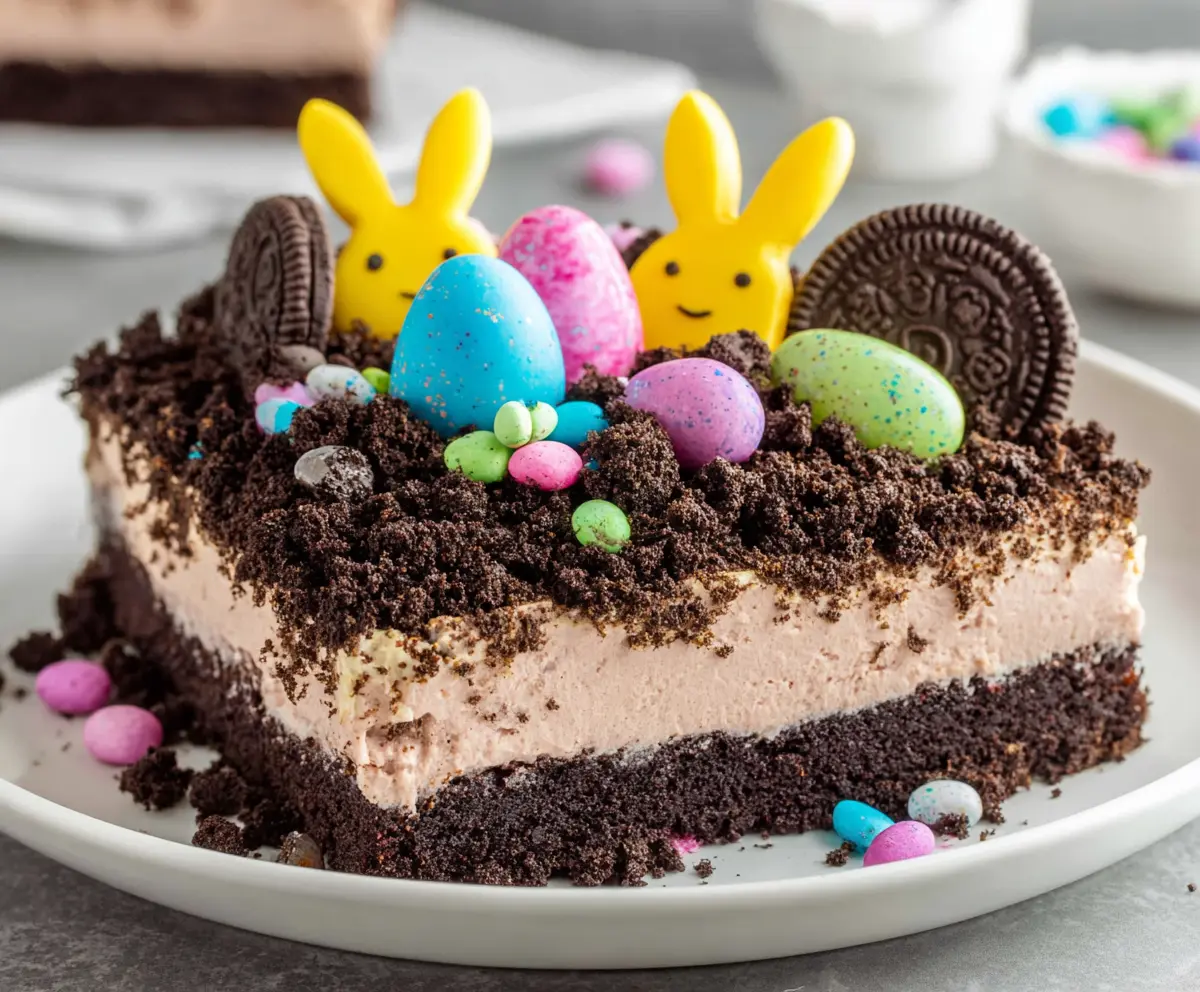 This fun Easter Dirt Cake is a delightful mix of chocolate pudding, cream cheese, and crushed cookies, topped with cute gummy worms and colorful candies. It’s like a little garden in a bowl!