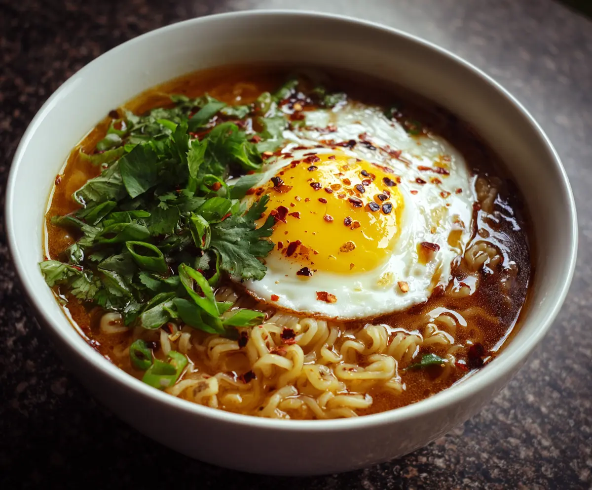 Carefully pour the hot soup into a bowl. Garnish it with extra green onions and a pinch of red pepper flakes or chili powder if you like a little spice. Now, dig in and enjoy your comforting Egg Drop Ramen Soup!