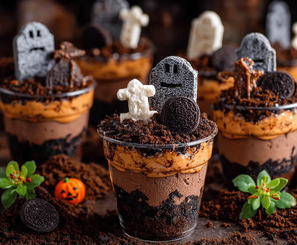 Graveyard Dirt Cups are a fun and spooky dessert perfect for Halloween! They are made with chocolate pudding, crushed cookies, and gummy worms, all layered to look like a spooky graveyard.