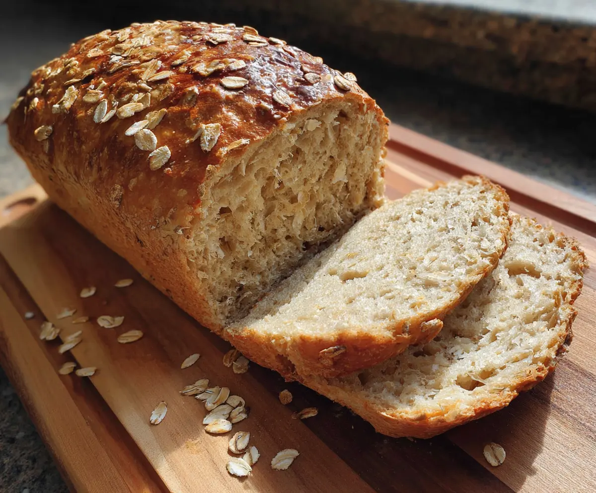 Once the loaf has risen, brush the top lightly with water or milk and sprinkle rolled oats evenly over the surface for an appealing look. Bake in the preheated oven for 35-40 minutes, or until the crust is golden-brown and sounds hollow when tapped.