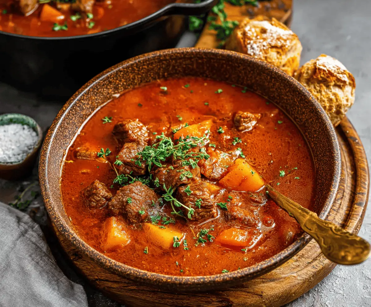 Enjoy this warming, authentic Hungarian Goulash with its signature paprika flavor and tender beef pieces! A comforting dish that’s sure to bring smiles around the table. 😊