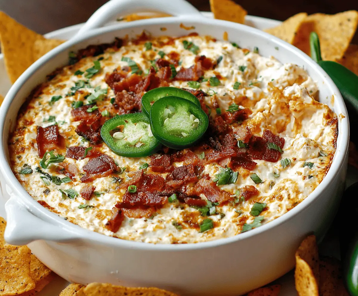 After baking, carefully remove the dip from the oven. Let it cool for a couple of minutes, then garnish with sliced fresh jalapeños and any extra bacon pieces you saved. Now it’s time to dig in!