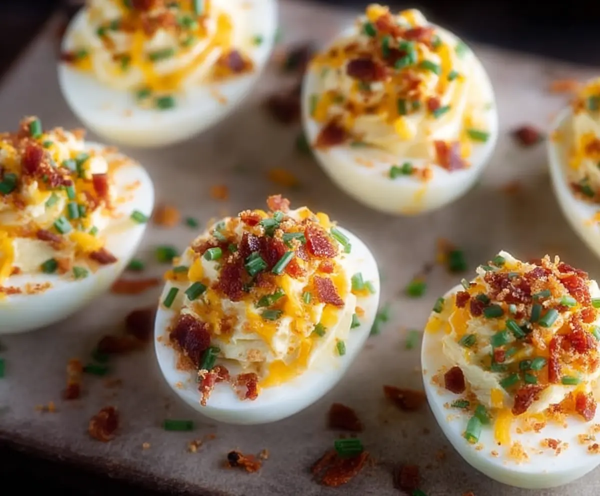 Sprinkle the remaining cheddar cheese and bacon on top of each deviled egg for that extra flavor. Garnish with a sprinkle of chopped chives and a light dusting of paprika if you like!