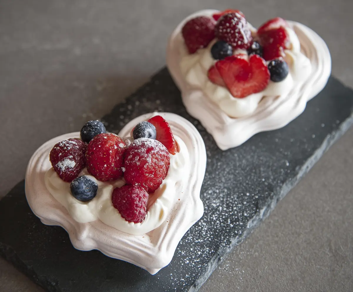 Finish with a light dusting of powdered sugar for a sweet touch. Serve immediately and savor these delectable, airy mini heart pavlovas!