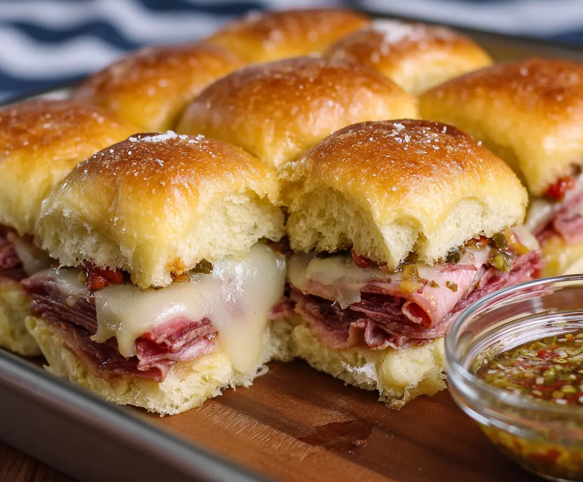 Muffuletta sliders are mini sandwiches packed with flavor! They feature layers of tasty meats, cheeses, and a zesty olive salad all on soft rolls. Perfect for parties or a fun snack!