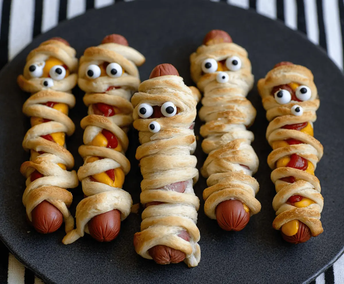 Mummy Hot Dogs are a fun and spooky treat perfect for kids! Just take some hot dogs, wrap them in crescent roll dough, and bake until golden. They look like little mummies! 🎃