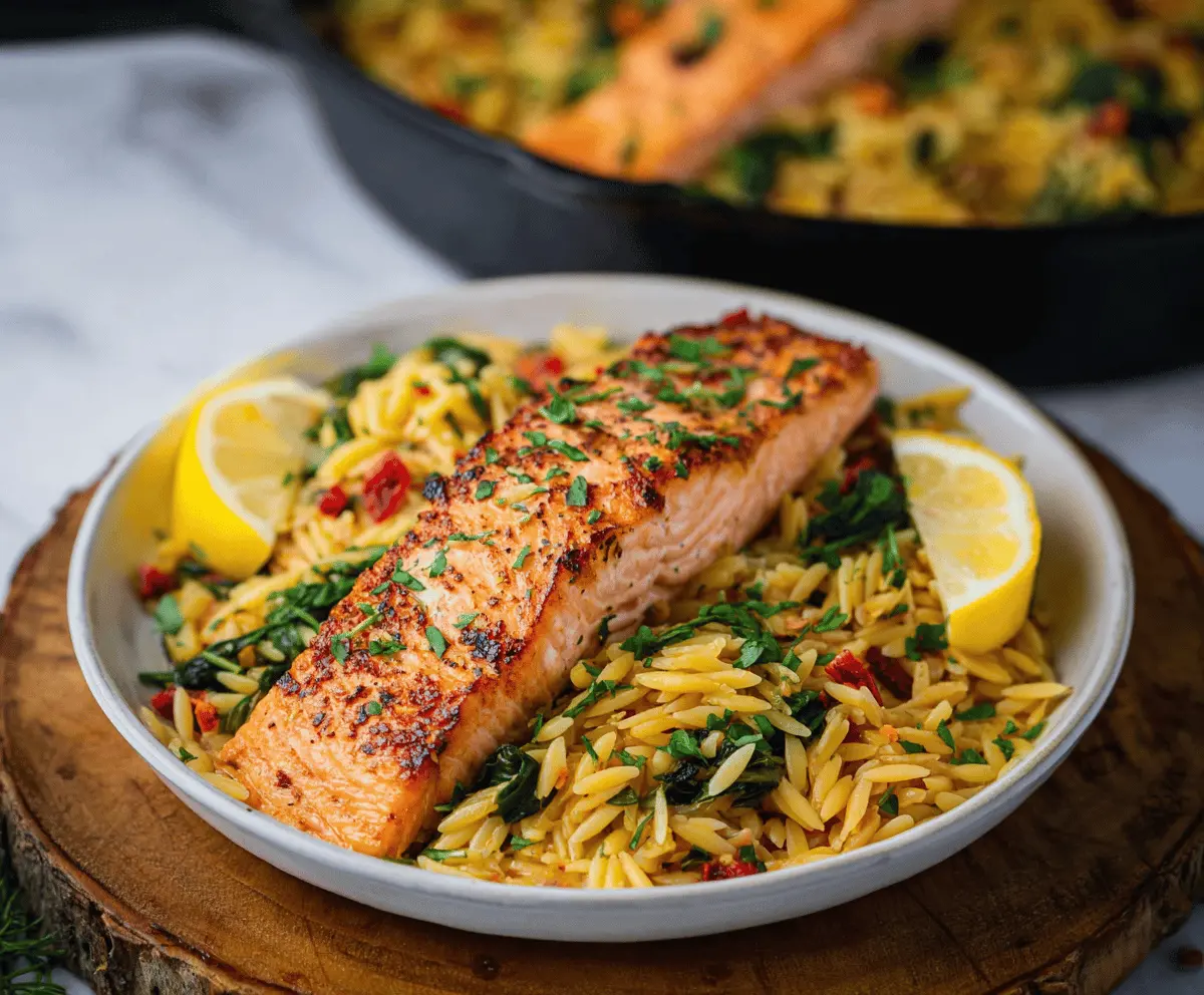 Now it’s time to bring back the salmon! Nestle the fillets back into the skillet on top of the orzo mixture. Spoon some of the juices over the salmon to soak up all that delicious flavor. Cover the skillet and let it cook for another 2-3 minutes until the salmon is fully cooked and flakes easily with a fork.