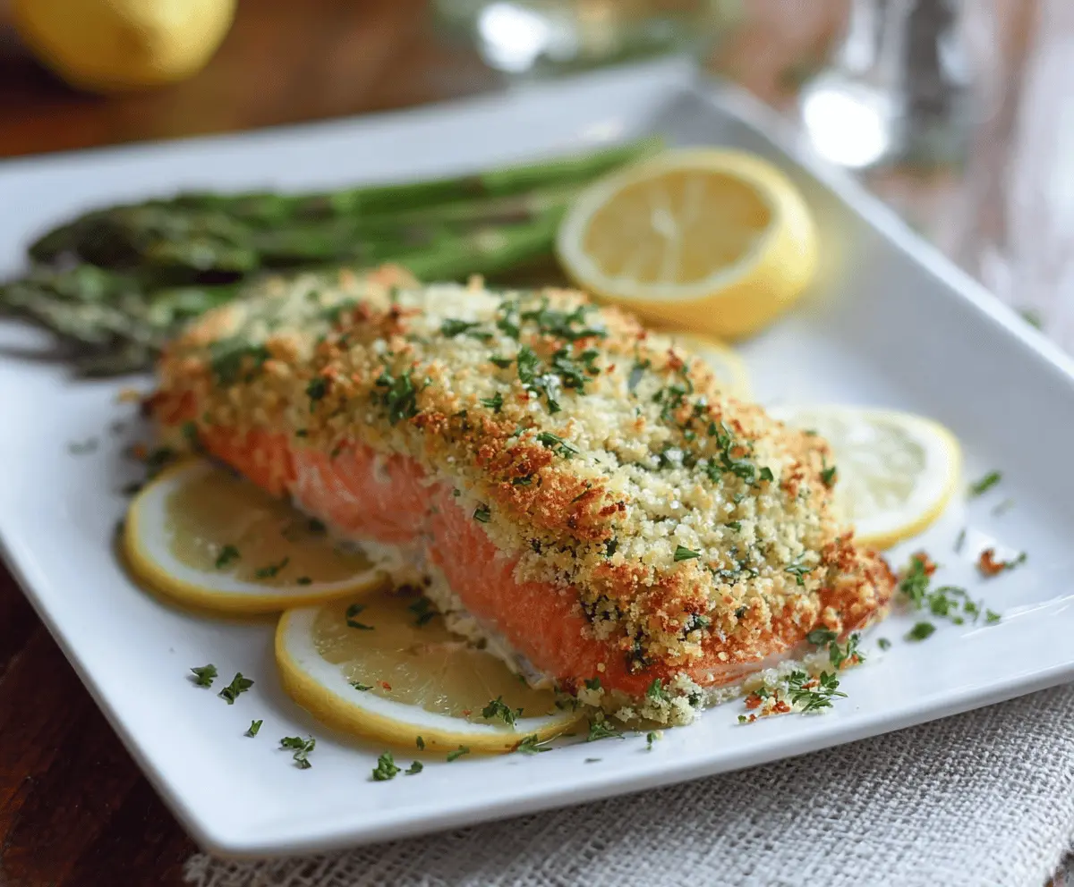 Garnish your dish with fresh thyme or parsley leaves and add lemon wedges on the side for an extra pop of flavor. Enjoy your Parmesan Crusted Salmon with all its deliciousness!