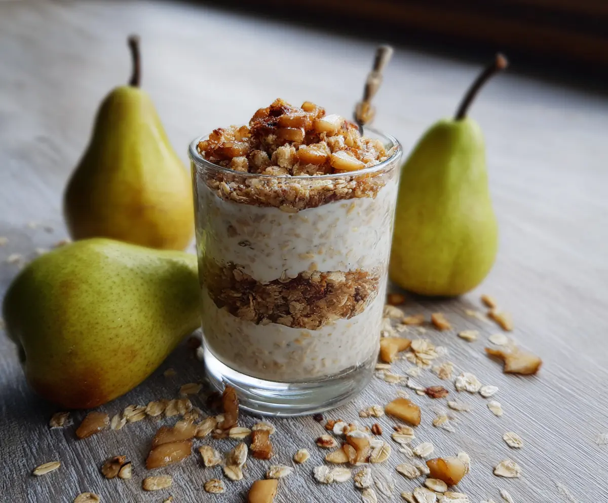 I love waking up to a bowl of these oats. It feels like dessert for breakfast, and the best part? No cooking required! Just mix, chill, and enjoy! 🍐✨