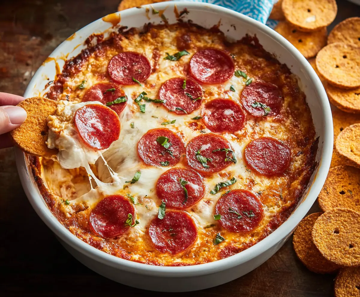 This tasty pizza dip has all your favorite pizza flavors, like cheese, pepperoni, and sauce, all mixed together and baked until warm and gooey. Perfect for sharing with friends!