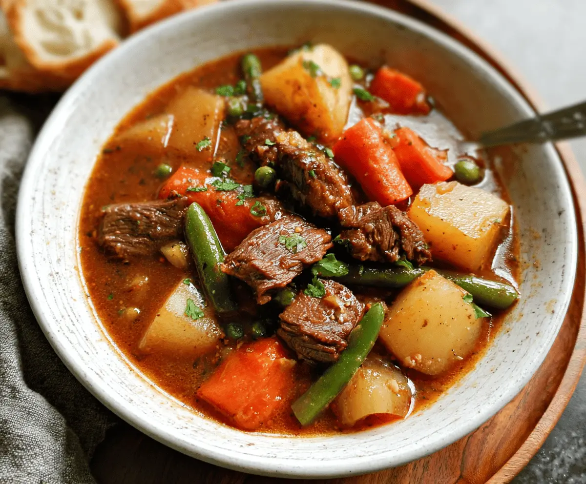 Serve your hearty beef stew hot, garnished with fresh chopped parsley. For the full experience, pair it with crusty bread for dipping. Enjoy every cozy bite!