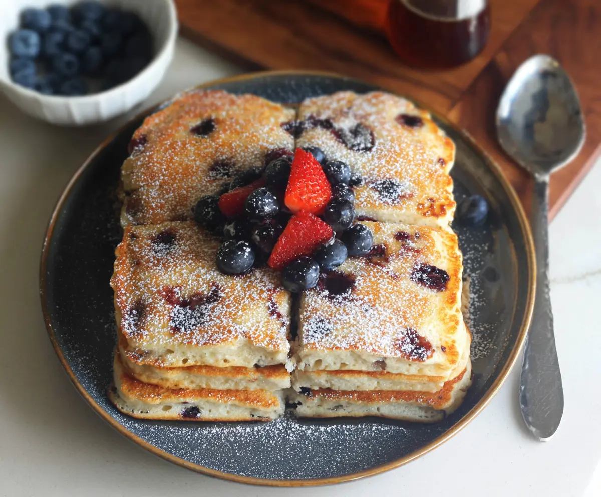 Serve the pancakes warm, topped with additional blueberries, a dusting of powdered sugar, and a drizzle of maple syrup. They’re sure to be a hit!