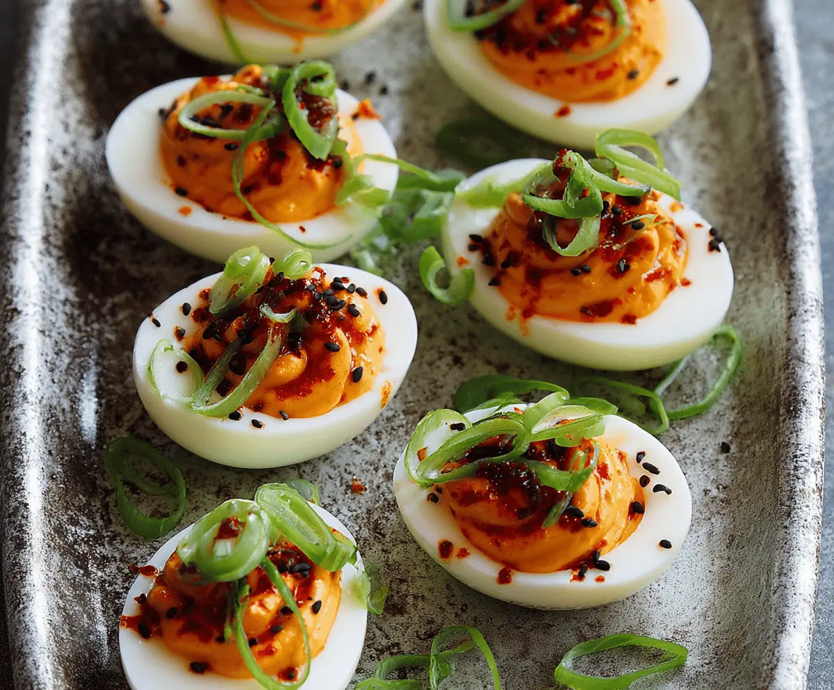 This recipe yields 12 deviled egg halves, each packed with a wonderful balance of spicy, savory, and creamy flavors enhanced by the nuttiness of sesame and freshness from green onions. Perfect for your next gathering! Enjoy!