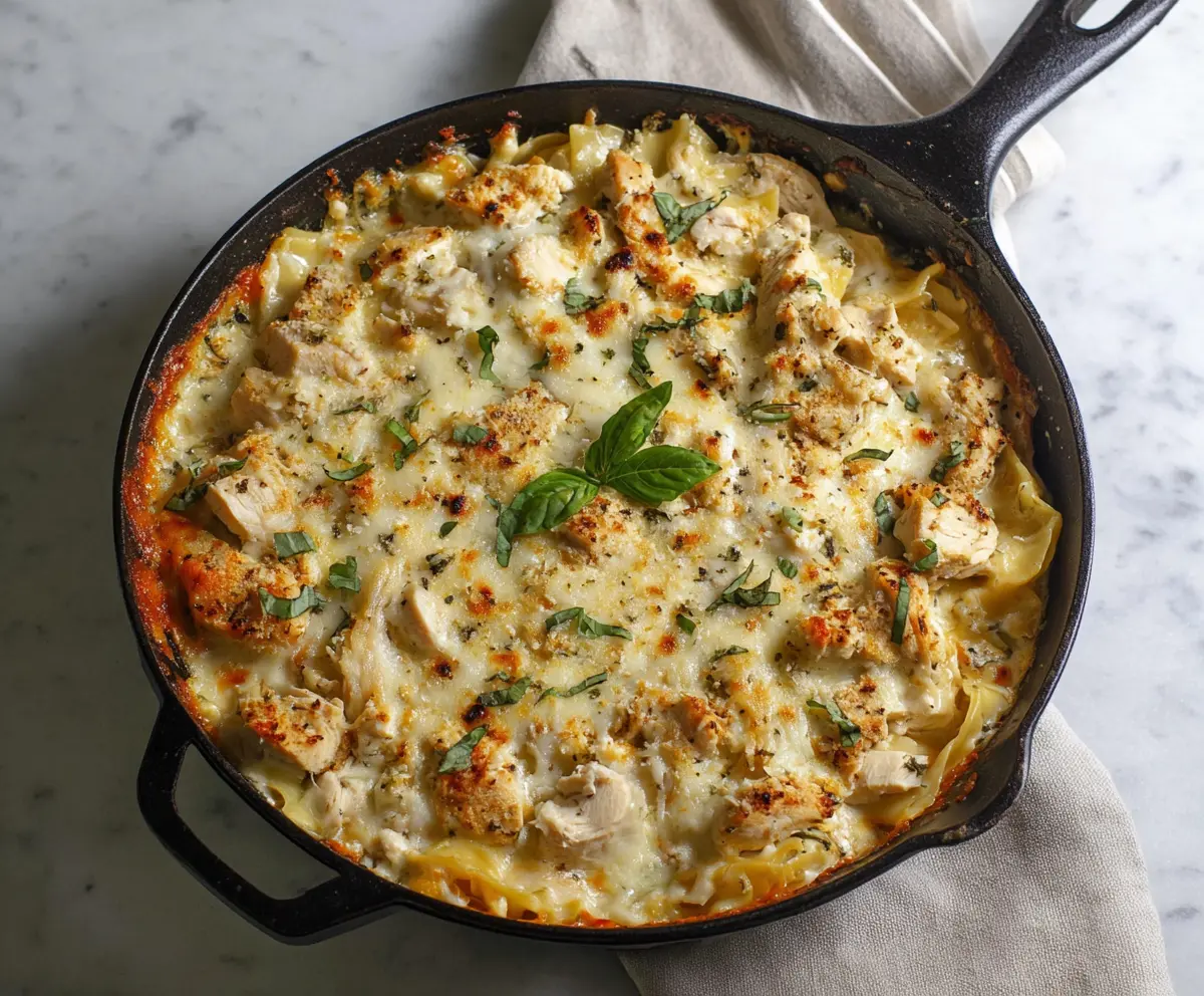Once it’s out of the oven, sprinkle some fresh basil over the top for a pop of color and flavor. Serve hot and enjoy your creamy, cheesy white chicken skillet lasagna!